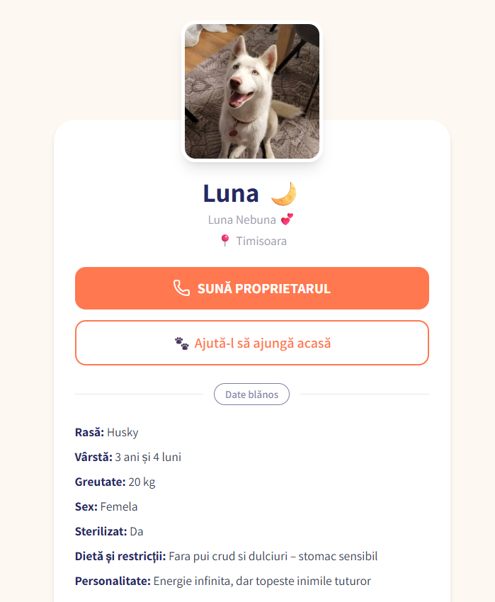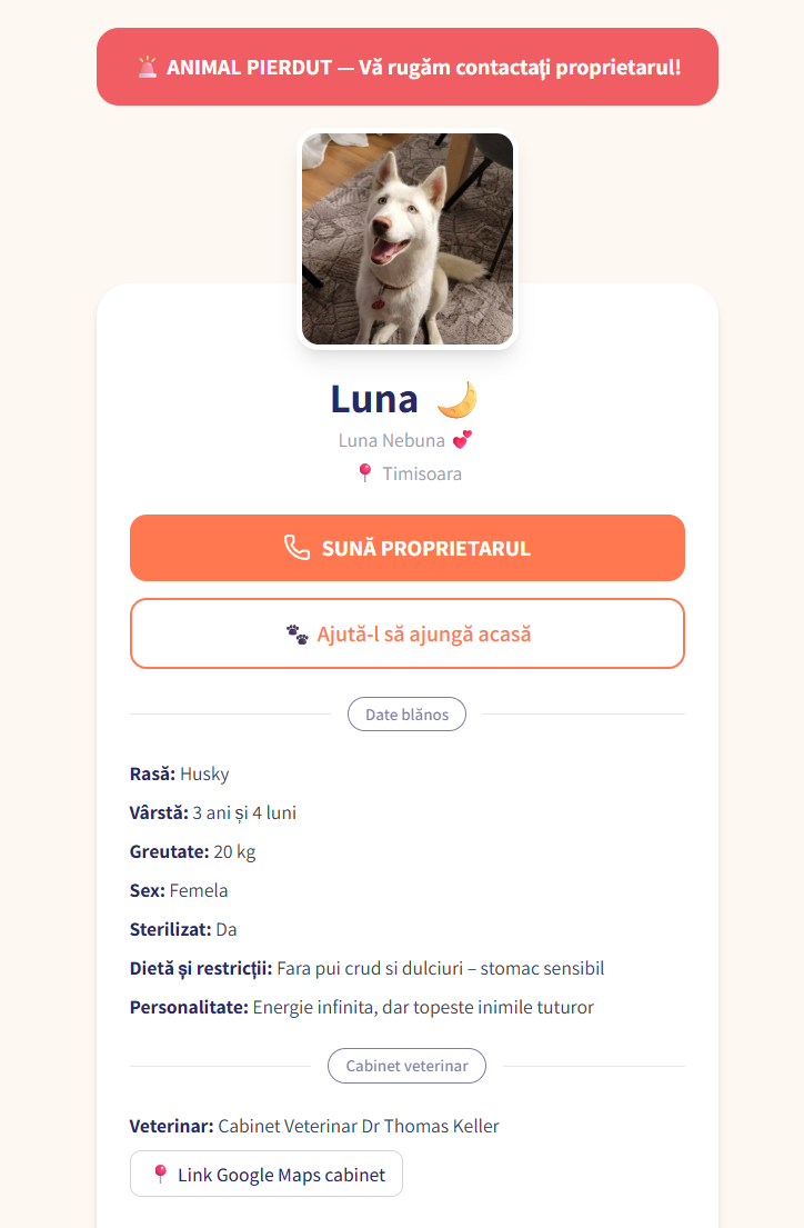 Spre deosebire de placutele gravate sau tatuajele de identificare, profilul blanosului tau exista online si poate fi actualizat in orice moment. Ti-ai schimbat numarul? Ai mutat? Actualizezi in 30 de secunde — medalionul ramane acelasi.